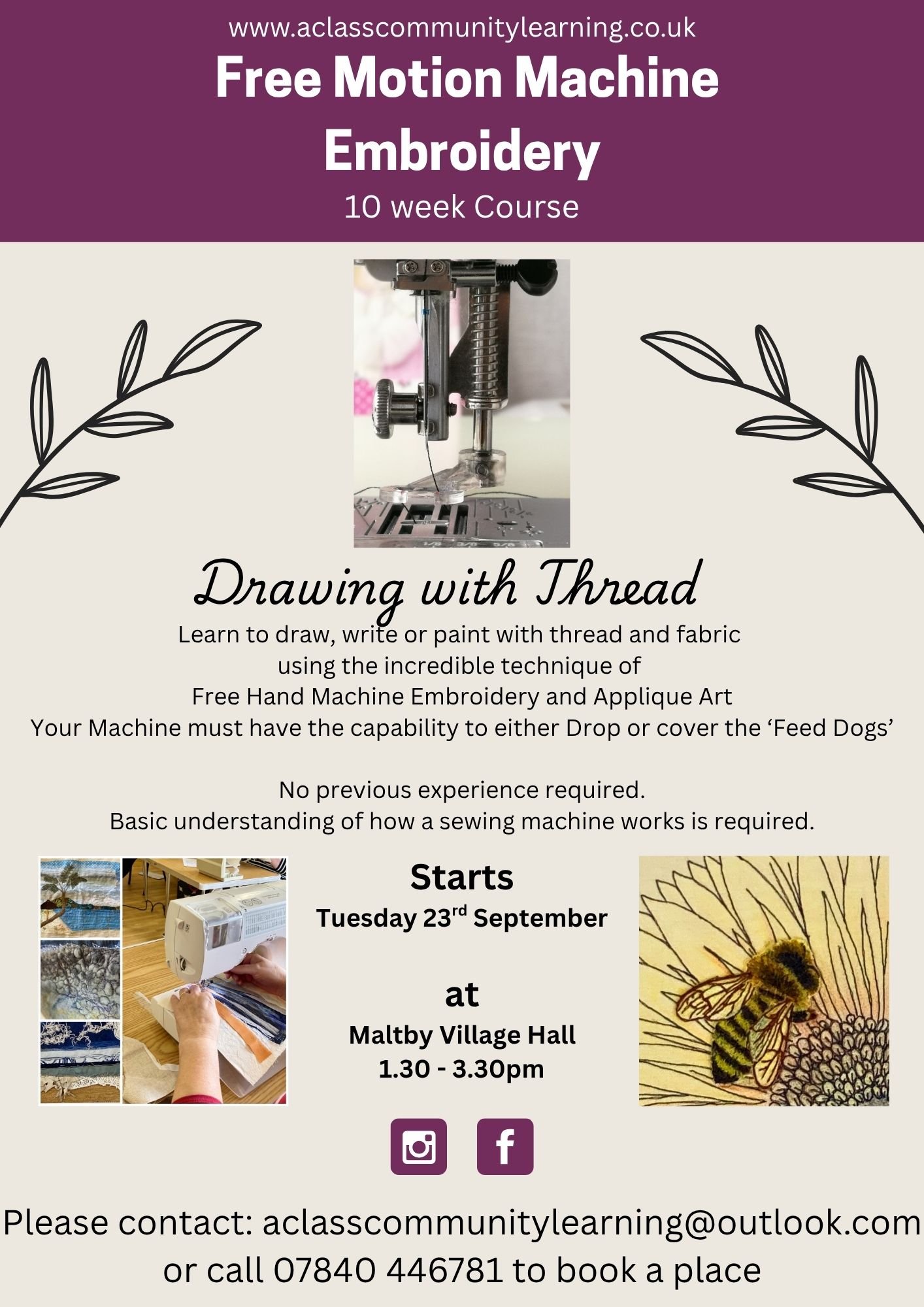A Creative Machine Embroidery course, where you will gain confidence and skills in Free Motion Machine Embroidery. We will begin by learning the basic techniques which will allow you to expand your skills and creativity, resulting in you being able to produce embroidered pictures and more using a variety of methods of Free Motion Embroidery.