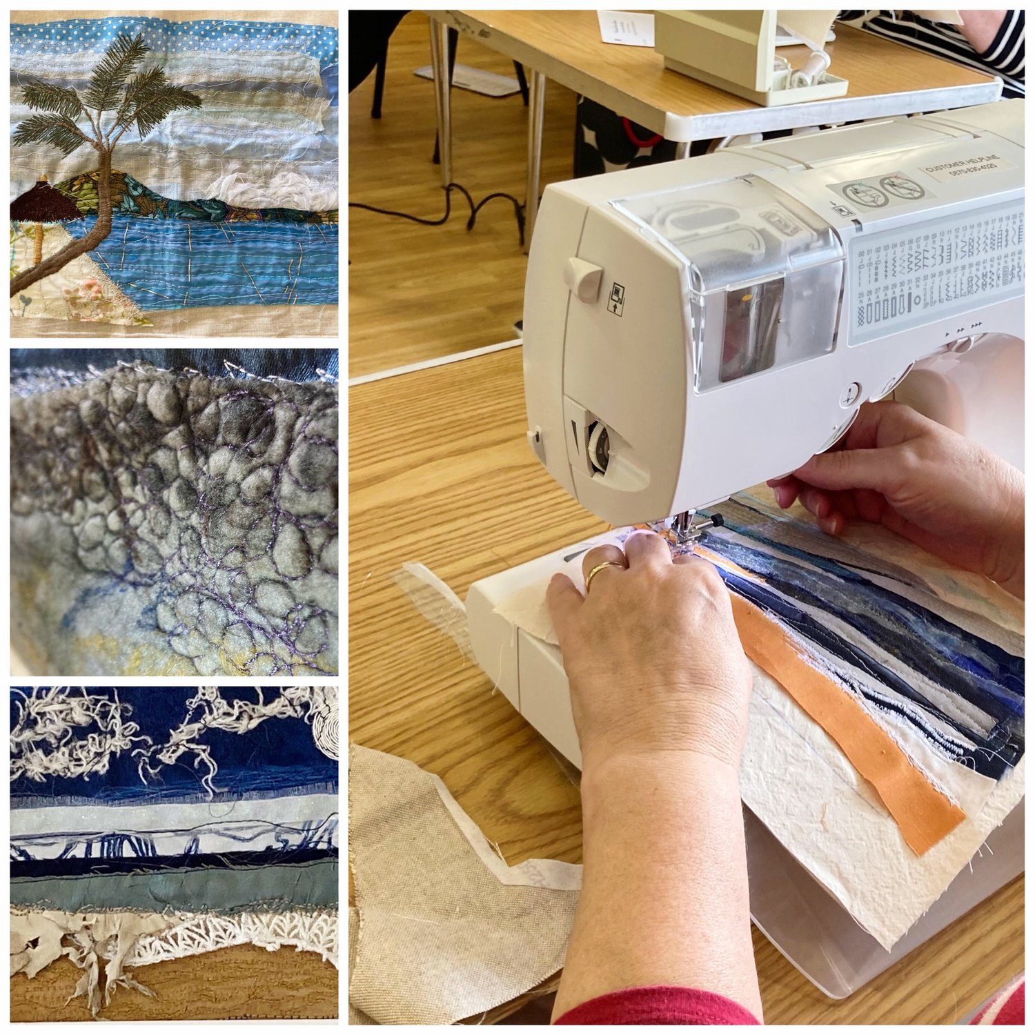 During the workshop you will learn how to set up a sewing machine for free motion embroidery. You will practice the techniques working on different samples of stitch. These include line and applique styles. After all the practice you will create your own collage or picture to take home.